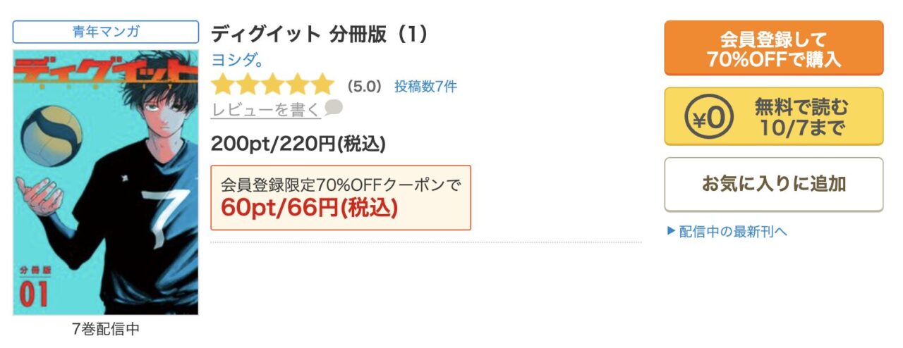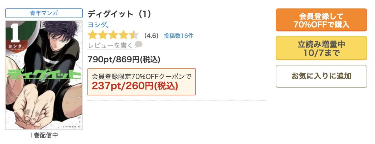 最大の魅力は、新規会員登録で貰える70%OFFクーポンです。このクーポンを使えば、『ディグイット』の1巻を非常にお得な価格で購入できます。まずは1巻を読んでみて、続きを読むかどうかを判断したいという方に最適です。