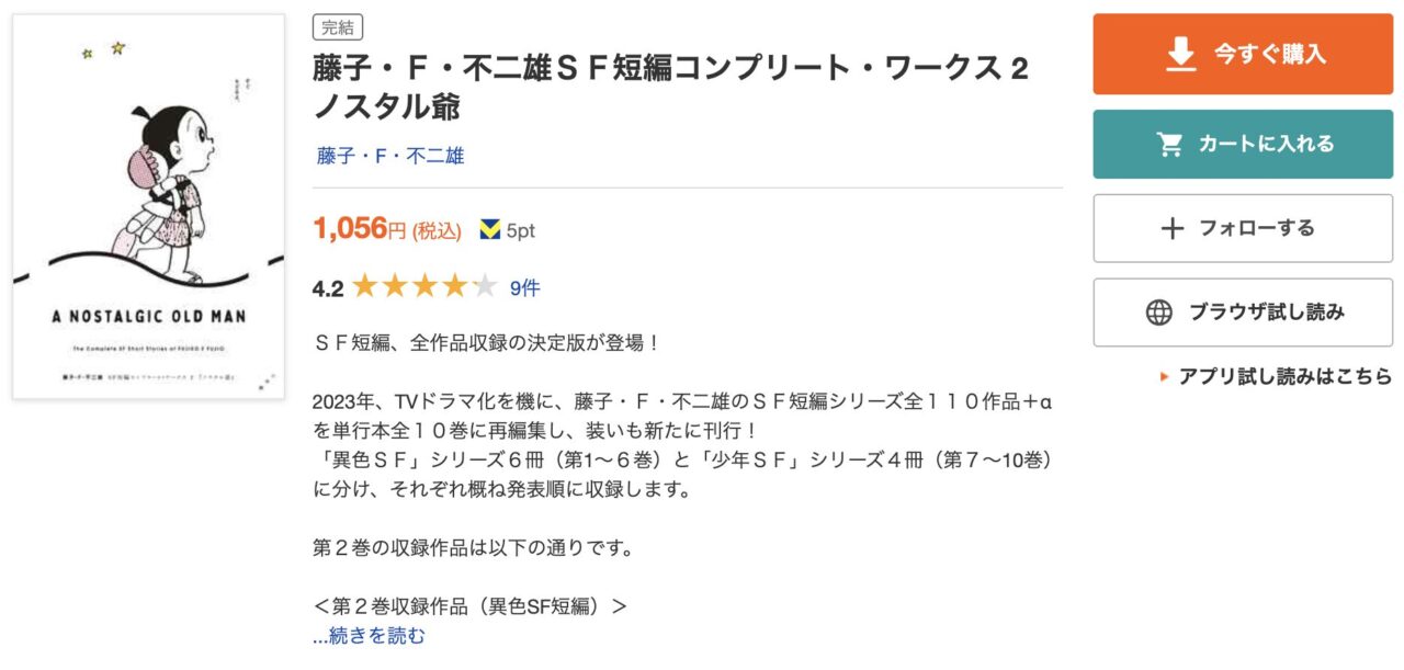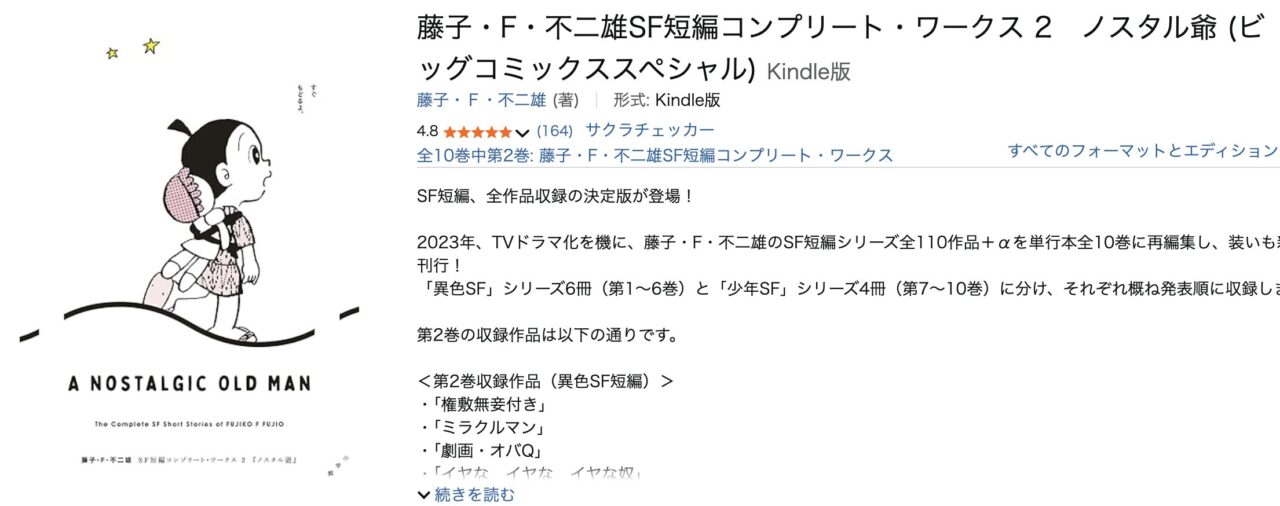 「オバケのQ太郎」のアニメや通常版コミックが配信されているサービスでも、この「劇画版」が含まれているとは限りません。必ず『SF短編コンプリート・ワークス』の第2巻であるかを確認してください。