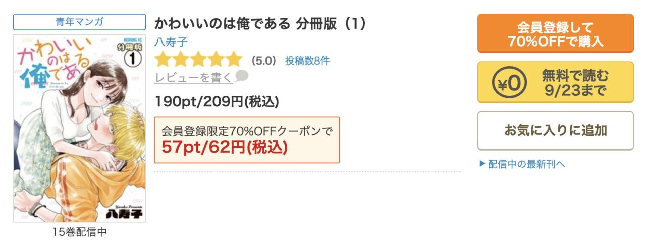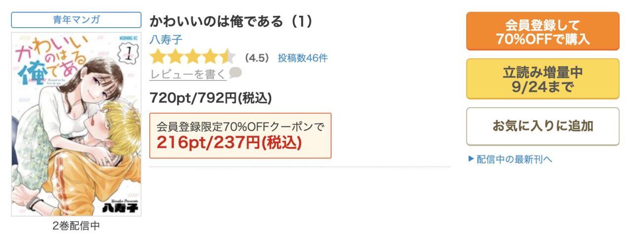 特に注目すべきは、新規会員登録でもらえる「70%OFFクーポン」です。このクーポンは1冊限定ですが、『かわいいのは俺である』の第1巻に利用すれば、定価792円(税込)のところ、約238円(税込)という破格の値段で購入できてしまいます。