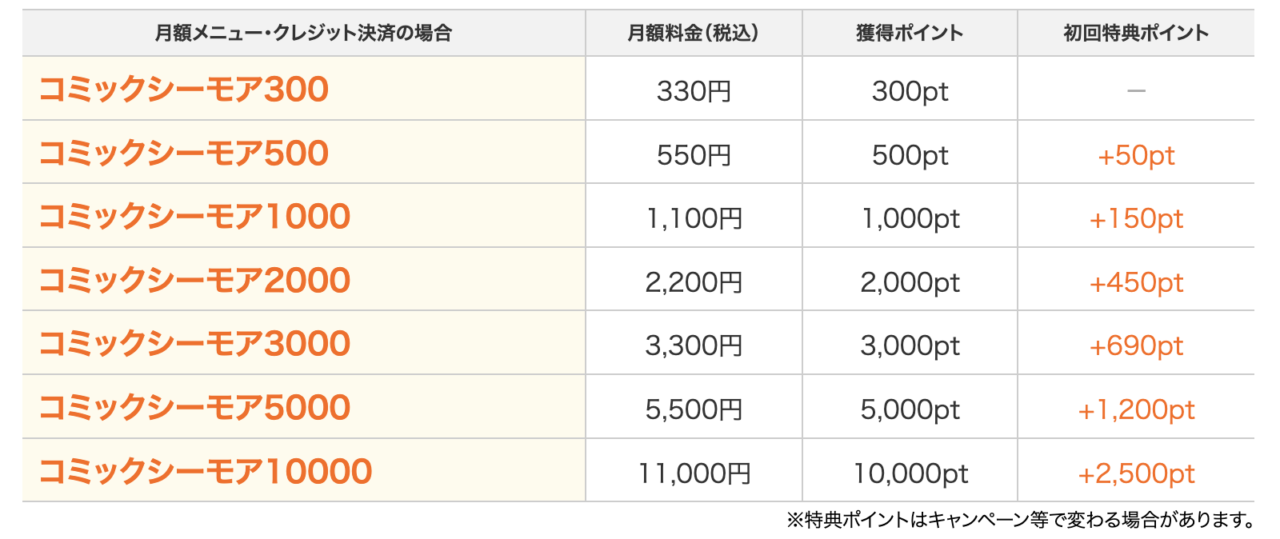 コミックシーモア最大の特徴であり、最強のメリットと言えるのが「月額メニュー」というポイント購入システムです。