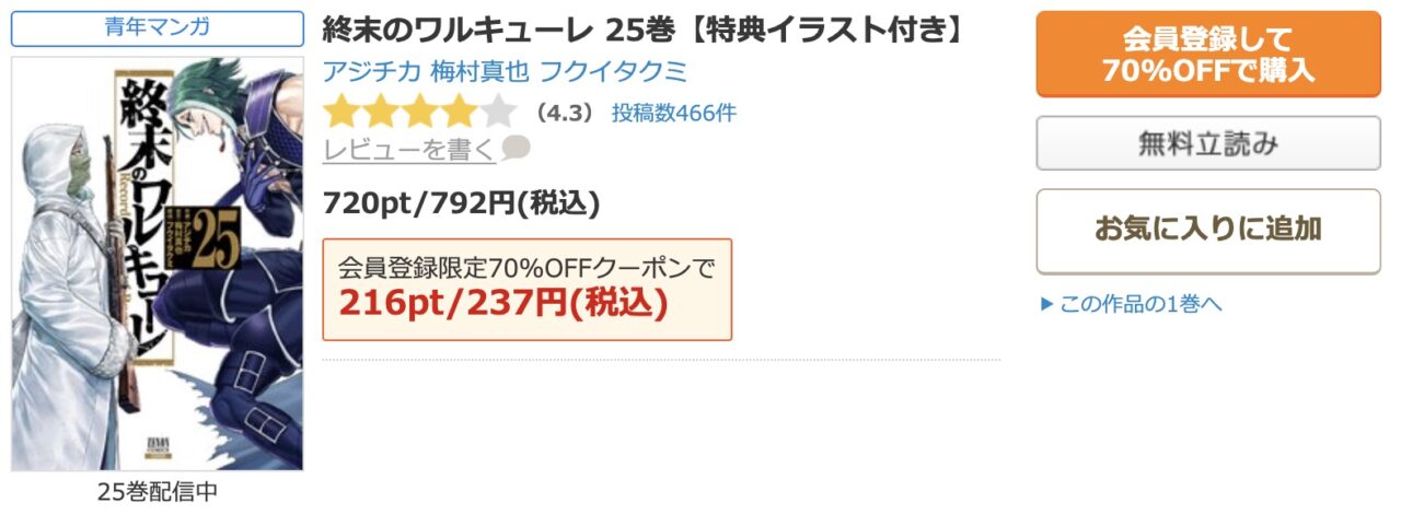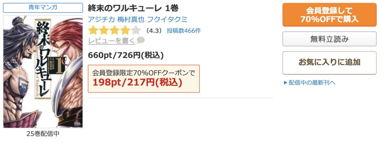 まず、新規会員登録をするだけで、好きな作品1冊に使える70%OFFクーポンが必ずもらえます。これを利用すれば、『終末のワルキューレ』の最新刊でも、定価の726円(税込)から約508円引きの約218円(税込)という破格の値段で購入可能です。