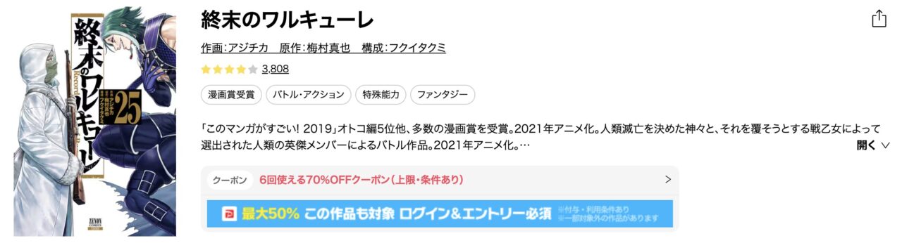 ebookjapanのクーポンは6回使えるため、『終末のワルキューレ』を1巻から6巻まで購入する場合に最適です。1冊あたり約226円で購入できる計算になり、非常にお得に物語を追い始めることができます。