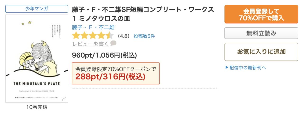 『ウルトラスーパーデラックスマン』が収録されている第3巻だけでなく、他のSF短編が収録されている続巻も合わせてカートに入れれば、実質的に破格の値段でF先生の傑作群を一気に揃えることができます。これは単発購入型のストアにはない大きなメリットですね。